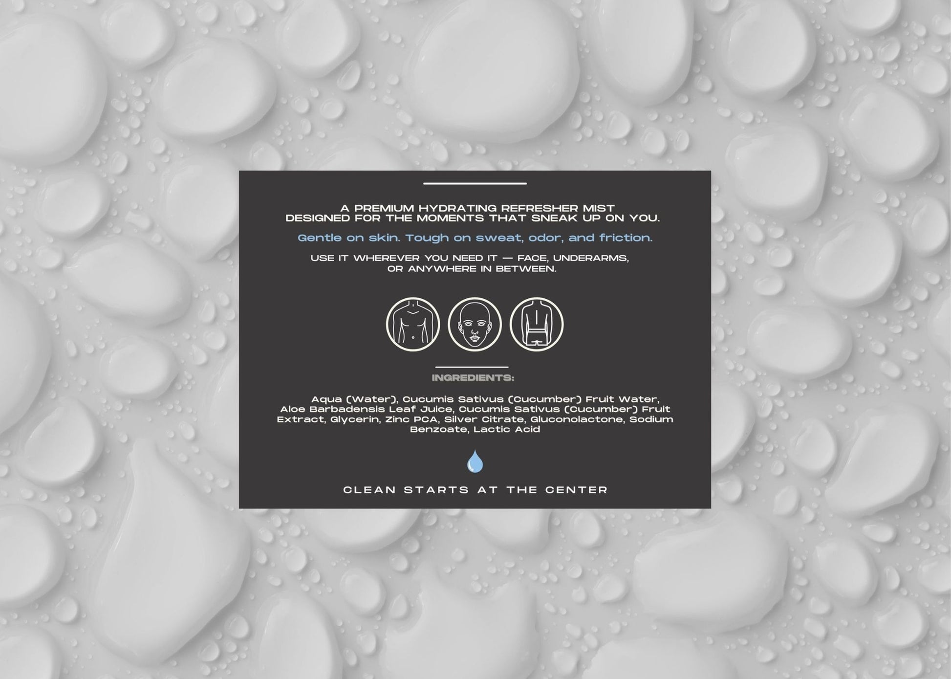 Mist where it matters. A cooling, alcohol-free spray designed to refresh your groin, underarms, neck, or face — anytime, anywhere. Made with purified water, witch hazel, and essential oils for a clean finish that leaves you feeling instantly reset. Discreet. TSA-sized. No overpowering scent. Just a moment of calm when you need it most.